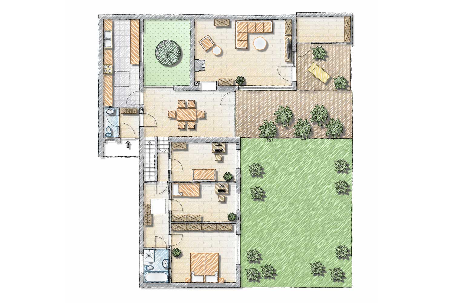 Der Atrium-Bungalow schafft ein besonderes Raumgefühl: Alle Zimmer orientieren sich zum geschützten Atrium-Garten und profitieren von Licht und viel Privatsphäre – perfekt für Paare und Familien. Das Herzstück des Hauses ist der Wohn-, Koch- und Essbereich, der sich auf einzelne Räume aufteilt, aber offene gestaltet ist. Ein zusätzliches Highlight ist der Patio, der kleine Innenhof mit Baum, der typisch für diese Bauweise ist.
