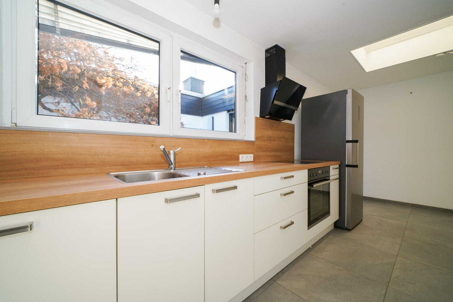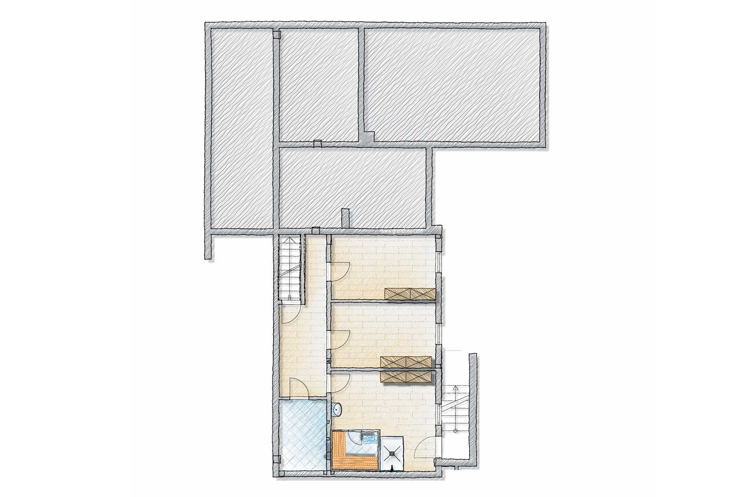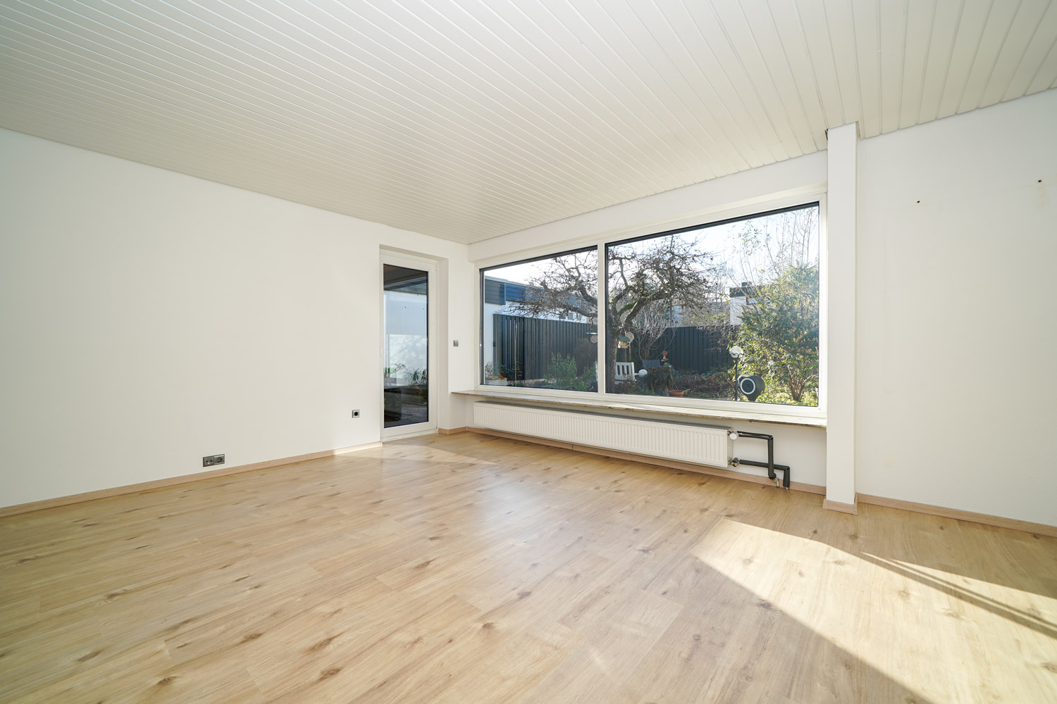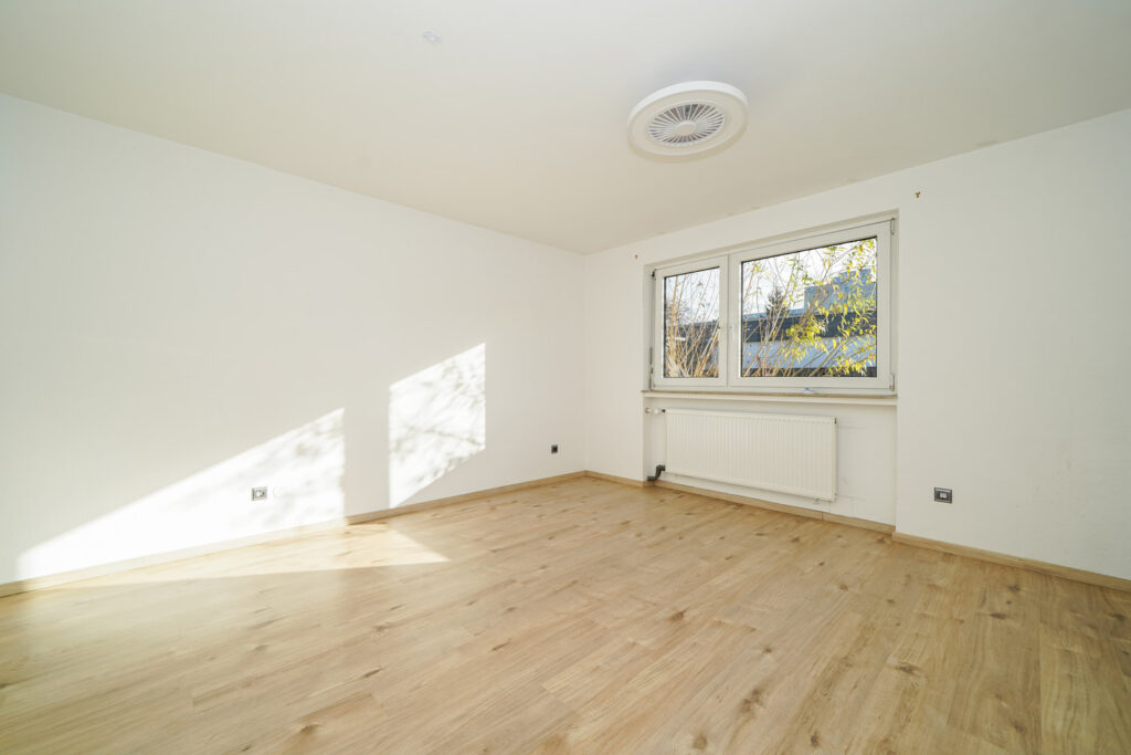 Über wenige Stufen gelangen Sie in den separaten Schlafbereich mit drei Zimmern, die sich flexibel als Schlafzimmer, Kinderzimmer oder Homeoffice nutzen lassen. In diesem Teil des Hauses befindet sich zudem das Tageslichtbad.