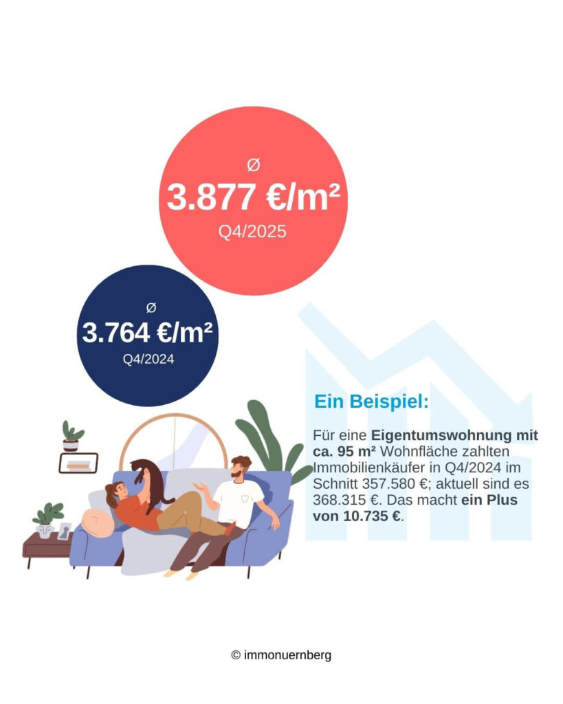 Ein Beispiel: Für eine Wohnung mit ca. 95 m² Wohnfläche zahlten Immobilienkäufer im vierten Quartal 2024 im Durchschnitt 357.580 € – im vierten Quartal 2025 sind es 368.315 €. Das macht ein Plus von 10.735 €.