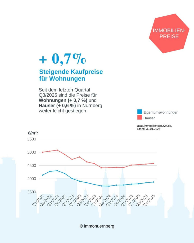 Der Nürnberger Immobilienmarkt befindet sich im Aufschwung: Im vierten Quartal 2025 sind die Preise für Eigentumswohnungen leicht um 0,7 % und für Häuser um 0,6 % gestiegen. Die Immobilienpreise verteuern sich seit mehreren Monaten moderat und der Markt zeigt sich stabil. Die Bauzinsen bewegen sich zum Jahresstart nahe der 4-Prozent-Marke für ein 10-jähriges Darlehen. Wir zeigen Ihnen, wie sich die Immobilienpreise in Nürnberg entwickelt haben, welche Stadtteile besonders gefragt sind und wie es 2026 am Immobilienmarkt weitergeht.