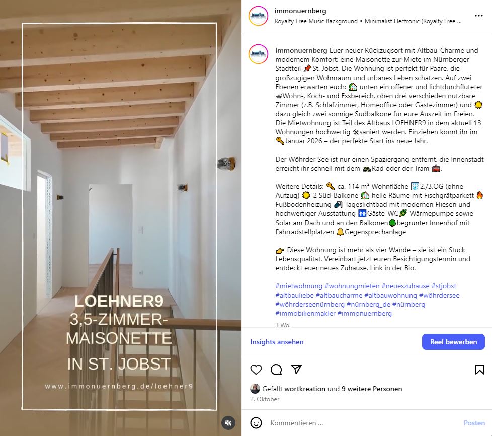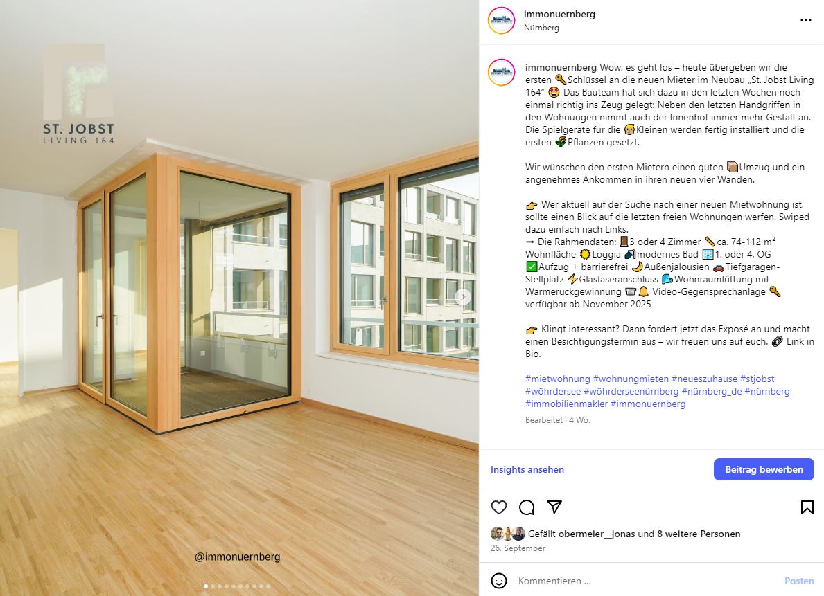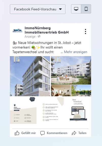 - Social-Media-Beiträge auf den ImmoNürnberg-Kanälen und Schalten von Ads in den verschiedenen Vertriebsphasen