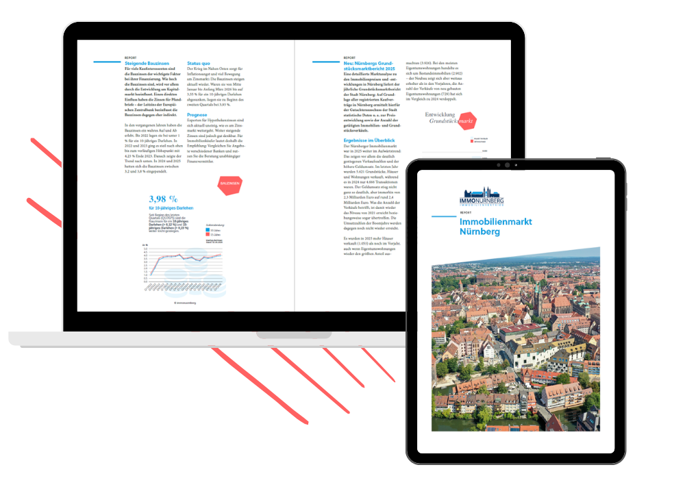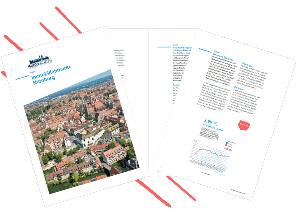 In unserem kostenfreien Report „Immobilienmarkt Nürnberg“ finden Sie die aktuellen Entwicklungen mit vielen Beispielen, übersichtlichen Grafiken und unserer Expertenprognose zusammengefasst.