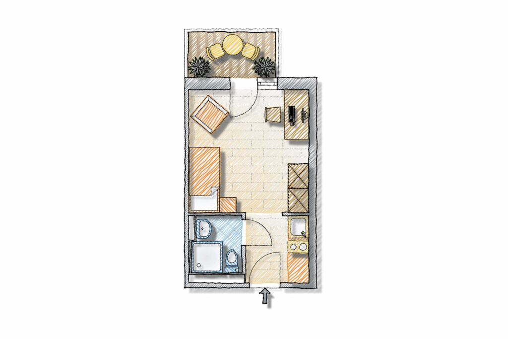 Zum Studentenwohnheim (BJ 2011) gehören 223 Einheiten. Das Apartment liegt im 2. OG, ist kompakt geschnitten und voll möbliert. Im Eingangsbereich befinden sich eine kleine Küchenzeile und das Bad. Der Bereich zum Wohnen, Arbeiten und Schlafen hat ca. 13 m². Hinzu kommt ein Balkon – ein echtes Plus für Lernpausen im Freien.