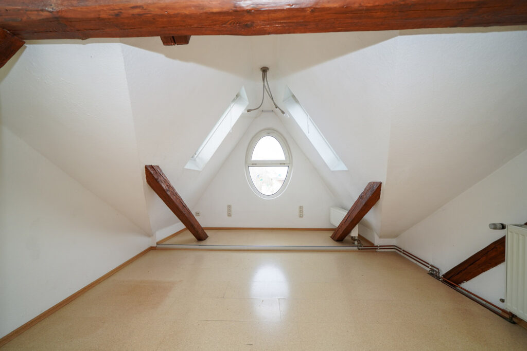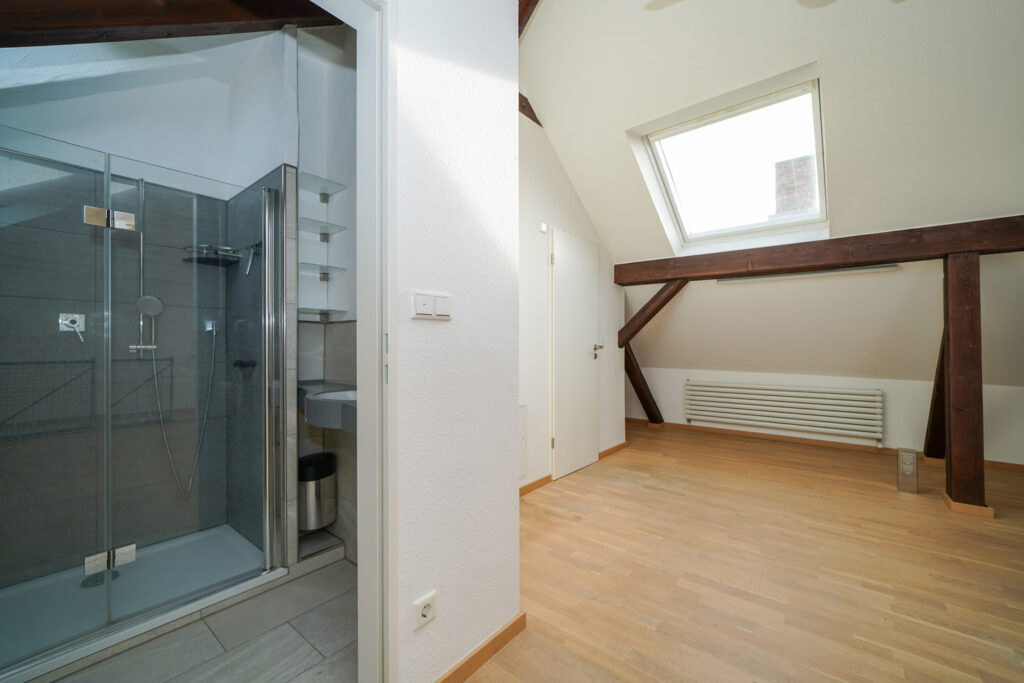 Die Wohnung verteilt sich über zwei Ebenen im 4. OG und im Dachgeschoss – ein Grundriss, der Freiraum schafft und das Wohnen strukturiert. Auf der unteren Ebene liegen Wohn- und Esszimmer mit Zugang zum sonnigen Süd-Balkon, eine separate Küche mit Speisekammer sowie drei flexibel nutzbare Zimmer. Das Tageslichtbad mit Wanne und Dusche und ein separates WC ergänzen diese Etage.