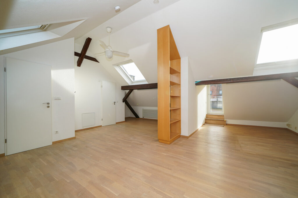 Von einem der Zimmer führt eine Treppe ins Dachgeschoss – mit einem zweiten, ca. 30 m² sehr geräumigen Wohnbereich mit großer Dachterrasse. Sie ist ohne Frage ein Highlight der Wohnung: ein ganz besonderer Außenbereich mit Blick über die Nachbardächer. Daneben liegt ein separater Hobbyraum, der über einen Flur außerhalb der Wohnung erreichbar ist und daher nicht offiziell zur Wohnfläche zählt. Ein Zimmer aber, das sich wunderbar als Lesezimmer und Rückzugsort eignet – und durch die Lage neben der Wohnung sehr privat ist.