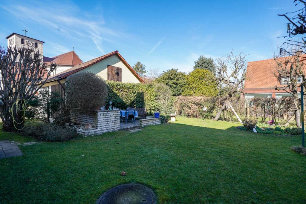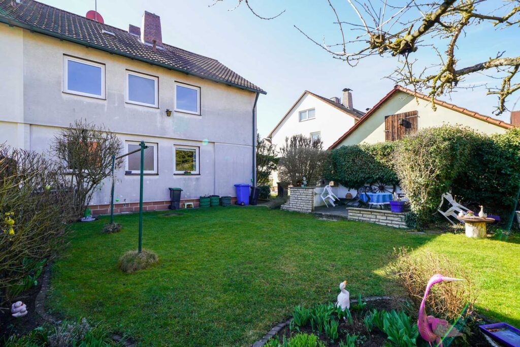 Der Garten mit Terrasse schafft Platz für gemeinsame Zeit im Freien – ob Spielen, Gärtnern oder Entspannen. Eine Garage gehört ebenfalls zum Haus.